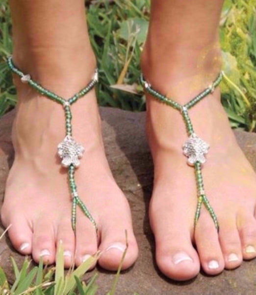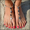 High gloss black beading with abalone shell and round purple spacers. Made with high quality elastic cording. US shoe size SM 5-6, MED 7-8 and LG 9 and up. Model is wearing size Medium.